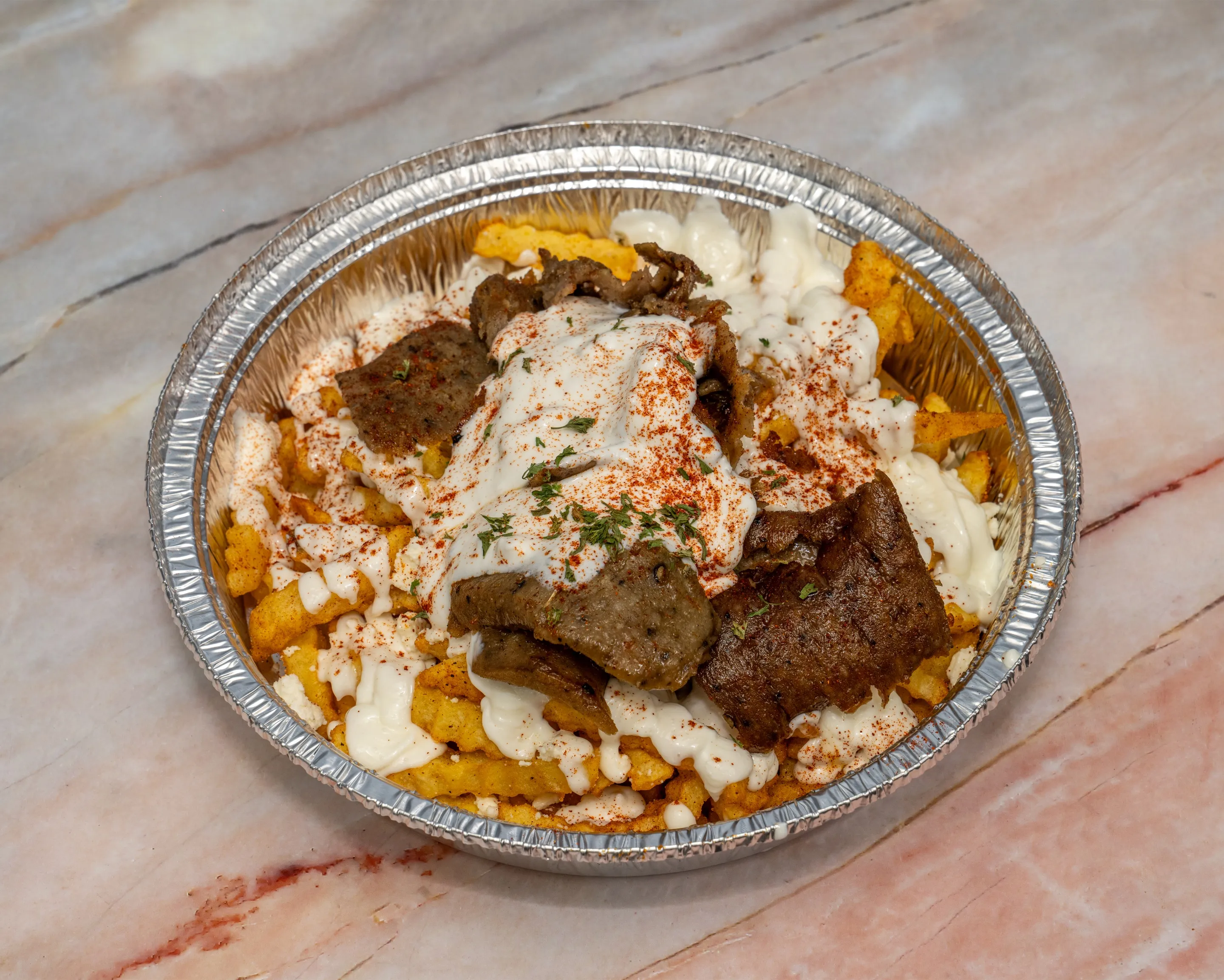 Hot, crispy fries topped with feta cheese, garlic sauce, slices of gyros and tziki sauce
